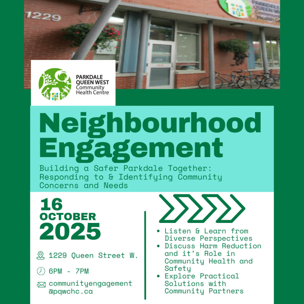 Our monthly neighbourhood drop-in happens every third Thursday and the next one is coming up on October 16 at 6 PM! Join us at 1229 Queen St W. Let’s build a safer, more connected community, together. All are welcome!